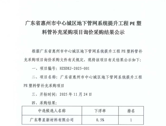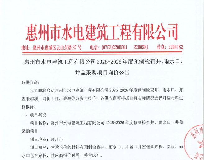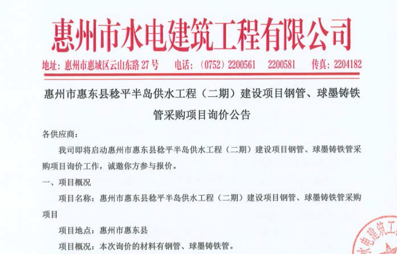 廣東省惠州市中心城區(qū)地下管網(wǎng)系統(tǒng)提升工程—雨水管網(wǎng)建設(shè)項(xiàng)目、惠州市增江龍門段治理工程施工(二標(biāo)段)塑料管及管件采購項(xiàng)目詢價(jià)公告……